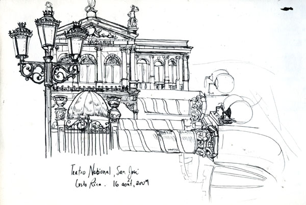 The Teatro Nacional in San José. San José really doesn’t have that much going for it in terms of architecture, but this is one of the better historical buildings. Unfortunately it was closed when I sketched this. I also got a sunburn while sketching this.