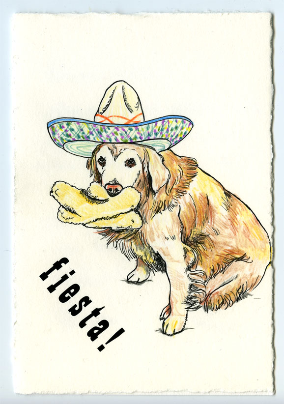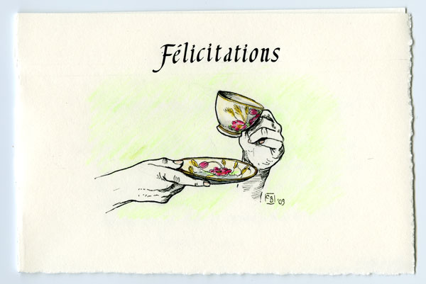 This card is a French language play on words. I wanted to congratulate my friend on becoming a lawyer, and the French word for lawyer is “avocat”, which also mean “avocado”. Hence, an avocado in a party hat. Done in ink and pencil crayon.