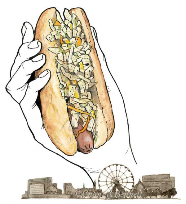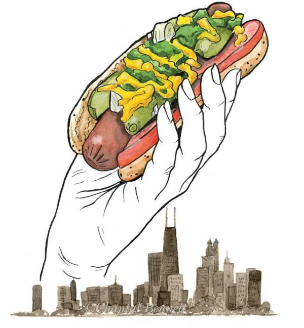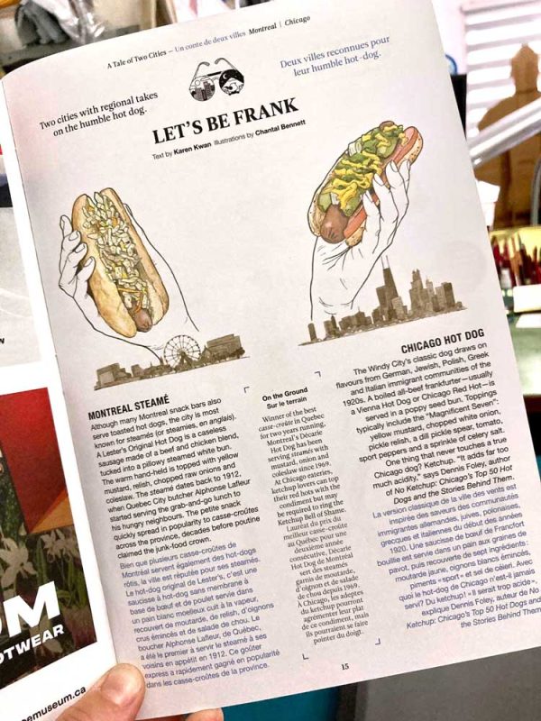 Illustrations of hotdogs from Montréal and Chicago.