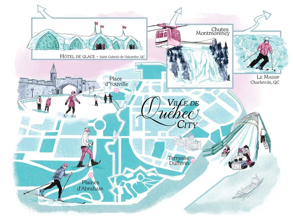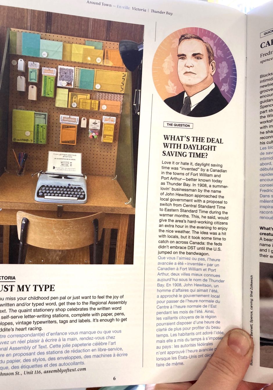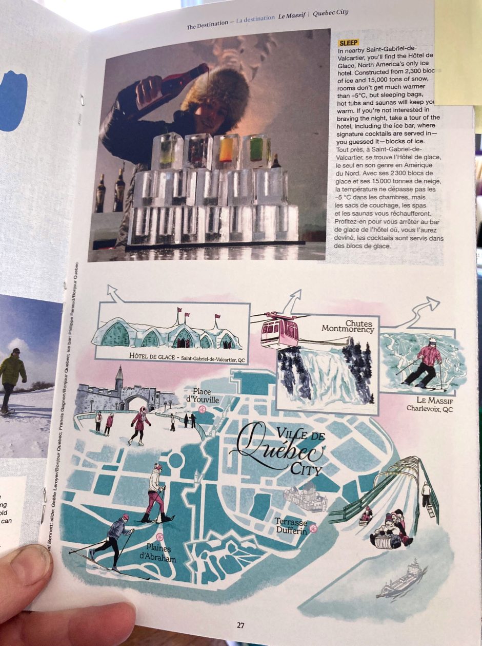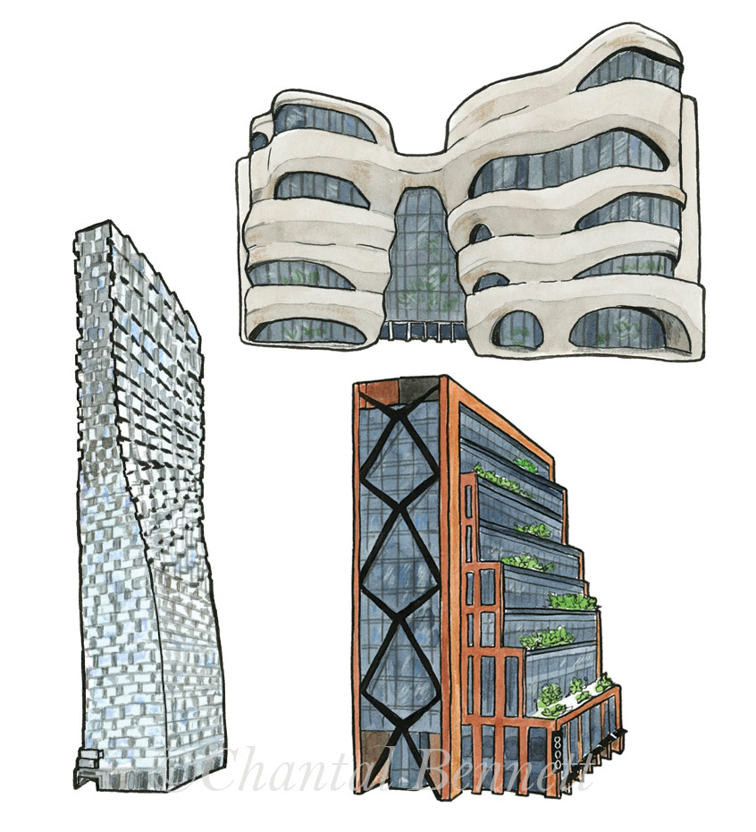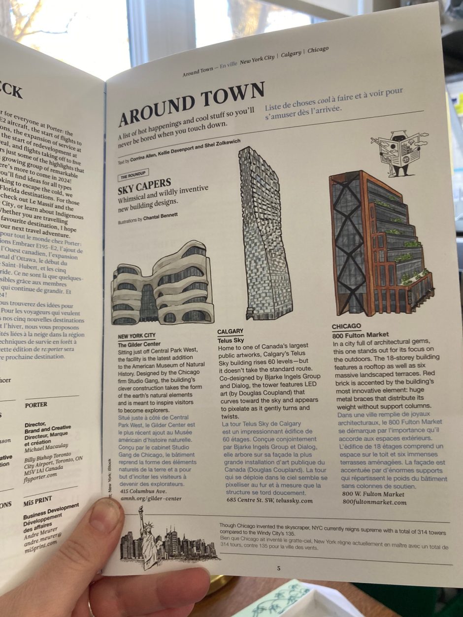 Spots illustrations of interesting skyscrapers, a portrait of the inventor of daylight savings time and a map of Québec for the inflight magazine of Porter Airlines