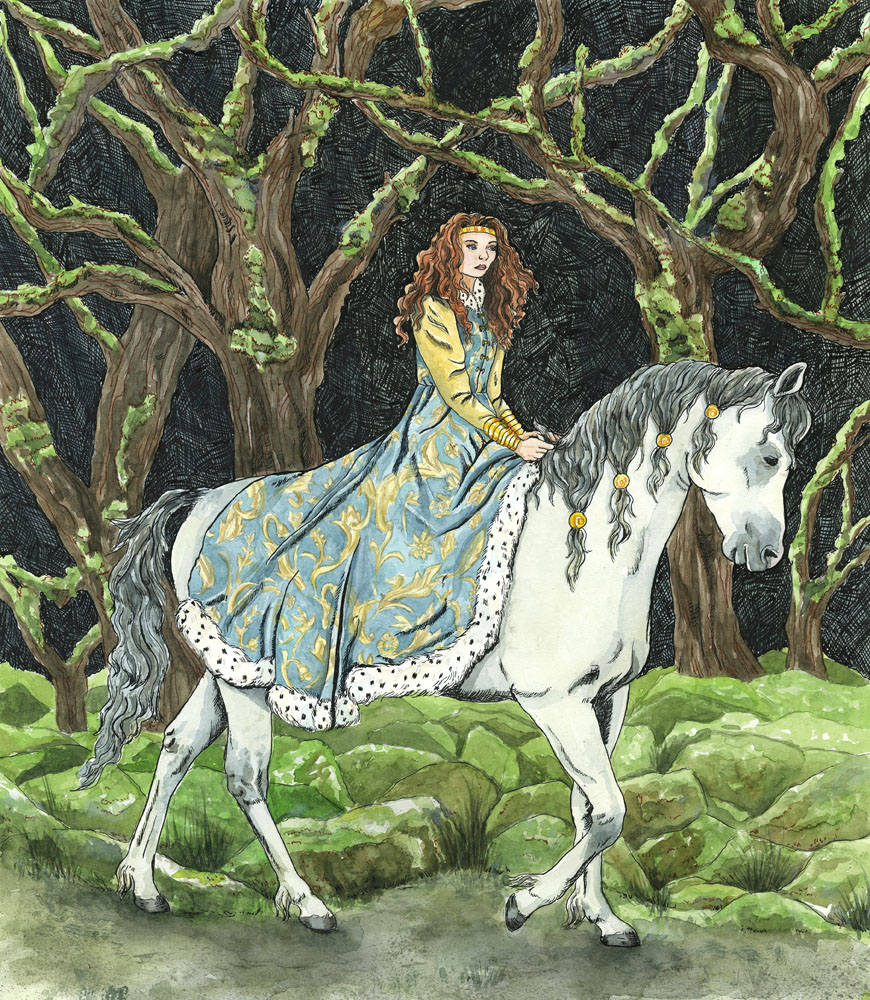 This is Rhiannon on her white horse when she is first glimpsed by Pwyll.